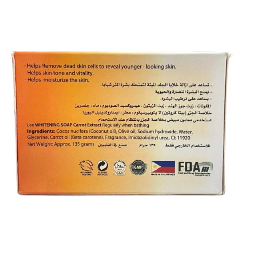 Renew Carrot Whitening Soap (135 g) is enriched with natural carrot extract, known for its skin-brightening and nourishing properties. This premium whitening soap helps reduce dullness, lighten dark spots, and promote a naturally radiant complexion. Its gentle cleansing formula removes dirt and excess oil while keeping the skin soft, smooth, and refreshed. Perfect for daily use to achieve healthy, glowing, and even-toned skin.