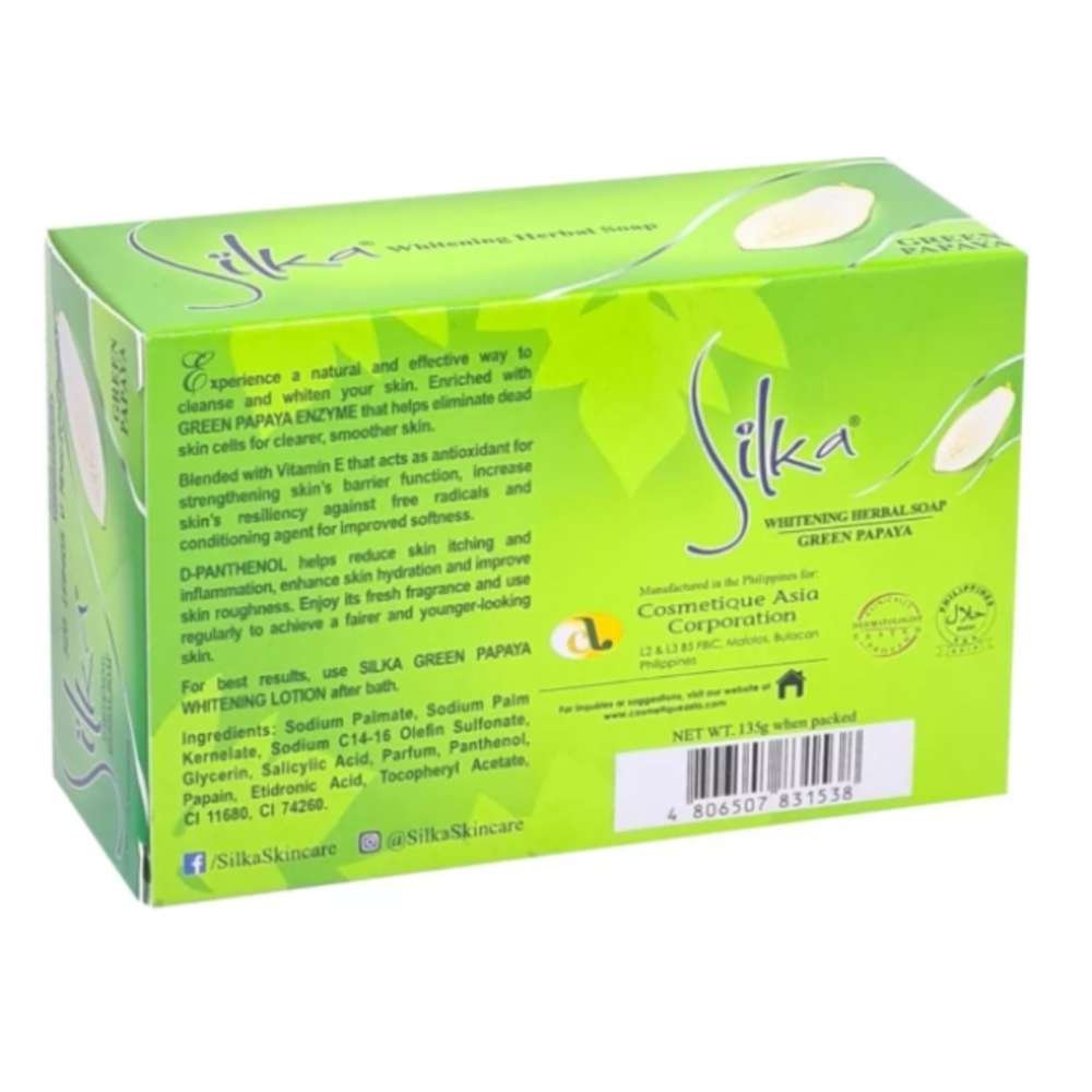 Reveal your skin’s natural glow with SILKA Green Papaya Soap. Made with 100% pure green papaya extract, this soap gently exfoliates dead skin cells, removes dirt and excess oil, and promotes a clearer, brighter complexion. Green papaya enzymes work effectively to lighten dark spots, smooth rough areas, and even out skin tone, while its rich, creamy lather keeps your skin soft and refreshed after every wash. Perfect for daily use on the face and body.